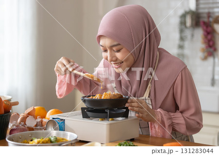 Muslim woman dressed in hijab happy cooking in modern kitchen, focusing on dish in pot with wooden spoon, have fresh vegetables and fruits placed nearby. joyful to scoop up and taste food.