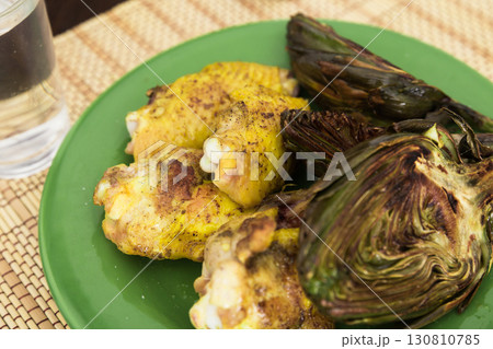 cooked fried chicken wings and halves artichokes on green plate