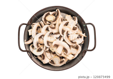 Sliced raw champignons Mushrooms in a kitchen tray isolated on white background.