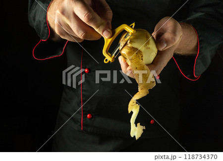 Peeling raw potatoes with a vegetable peeler in the hands of a cook. Concept of preparing for cooking French fries or chips. Advertising space