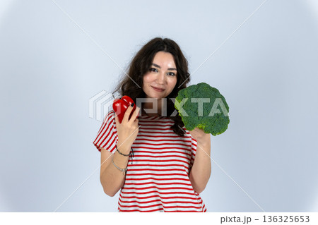 A young Asian woman wearing a conical hat holds a halved avocado while surrounded by fresh vegetables and microgreens, suggesting healthy eating and organic produce