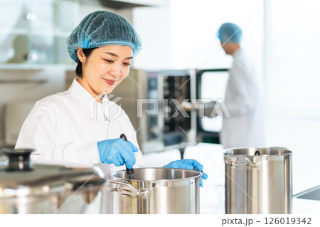 厨房で大鍋で調理する衛生白衣を着た女性調理師 給食センター 給食室