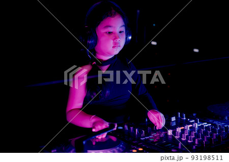 Asia little producer artist girl DJ in black headphones playing dance music and adjusting volume electronic sound mixer at the home party night