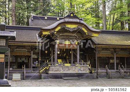 信州 諏訪 諏訪大社 諏訪神社の総本山 下社秋宮幣拝殿 立川富棟の華麗な彫刻 正面縦