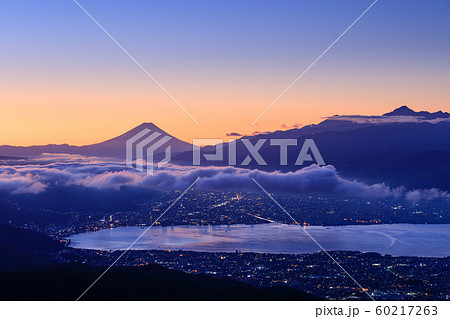 夜と朝の境目の富士山と諏訪湖 横サイズ