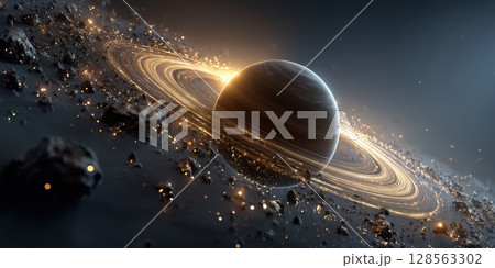 Massive brown planet with glowing rings surrounded by asteroids in space