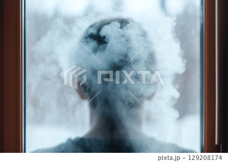 A shadowy silhouette of a person stands behind misted glass, their form obscured. The atmosphere suggests an air of mystery and invites curiosity about their identity and purpose