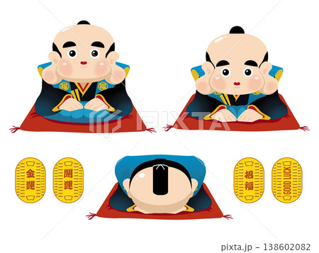 福助のお辞儀と小判セット:商売繁盛・開運を招く縁起物イラスト素材