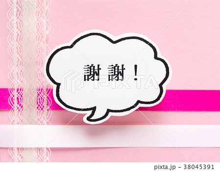 吹き出し 謝謝! ありがとう 感謝 繁体字 リボン ピンク色