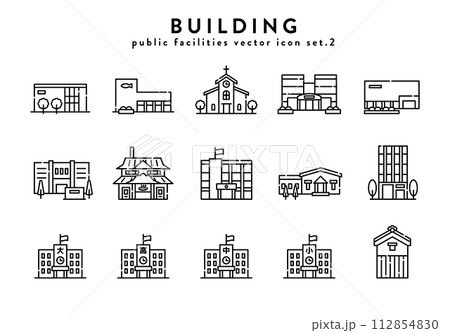 家、飲食店、学校、百貨店などシンプルデザインのアイコン素材セット