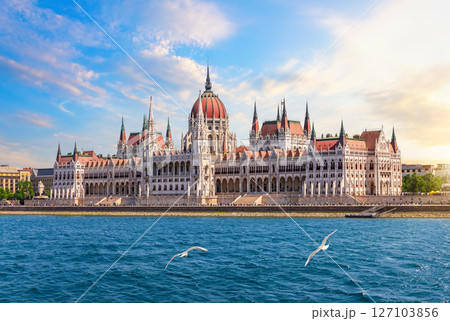 Wonderful sunset view of Hungarian Parliament building and Danube river in Budapest, Hungary