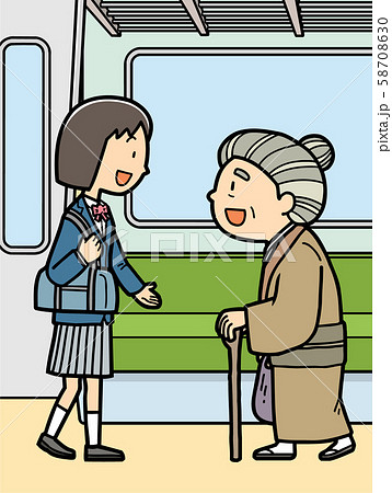 イラスト|電車|席を譲る|高校生|女子高生|制服|お年寄り|老人|おばあさん|マナー|通学