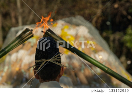 八幡のはちまんさんで実施される立ち上る炎の焼納神事を撮影