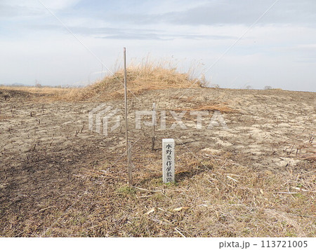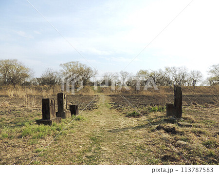 遊水地整備によって水没した、旧谷中村の跡地。 寺社仏閣の石碑や仏像などが残る。日本国栃木県にて。20