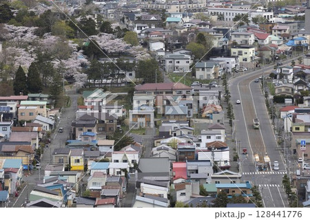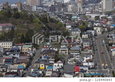 【社名等ぼかし、俯瞰写真】函館市函館公園と赤い路面電車(箱館ハイカラ號)