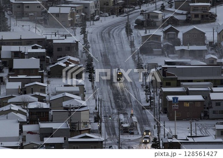【ローソンぼかし難】冬早朝終点を目指す路面電車 北海道函館市