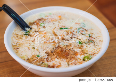 台湾・黒い背景の上の鹹豆漿(シェントウジャン)