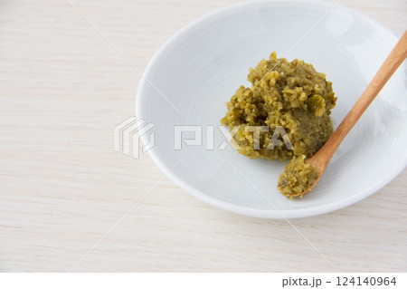 小皿に乗せた味噌の手描き水彩風イラスト