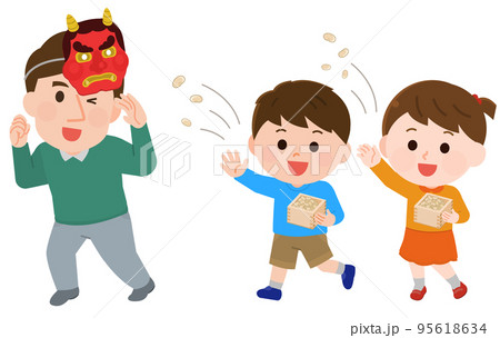 赤鬼に扮した父親 豆を投げる子どもたち イラスト