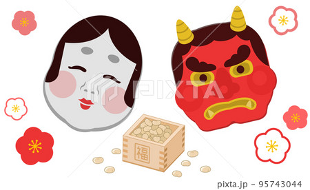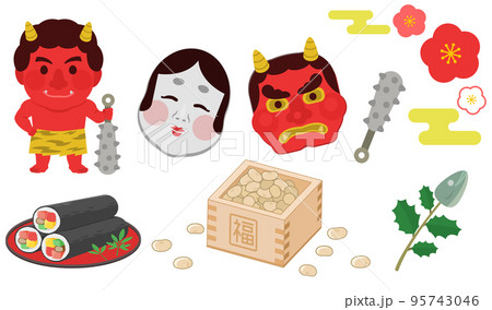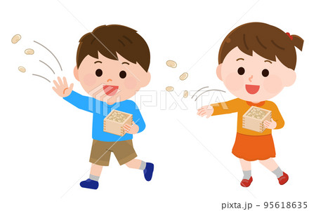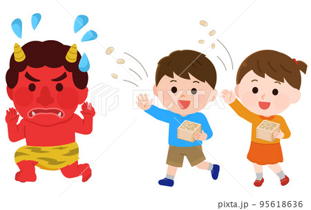 節分 赤鬼に豆を投げる子どもたち イラスト