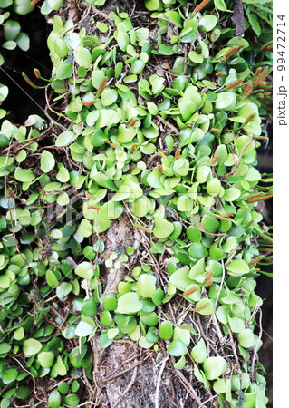 石垣に這う丸い葉のシダ植物 マメヅタ 豆蔦 差し込む光に当たる石垣のマメヅタ