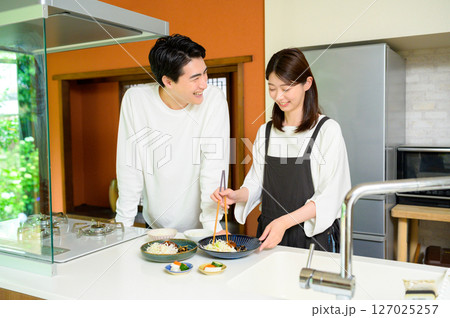 キッチンで笑顔の男女が料理を仕上げる楽しい朝