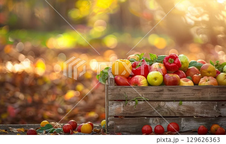 Harvest basket overflowing with fresh vegetables and autumn leaves in sunny forest setting during fall