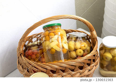 Canned compote in jars of various fruits and berries in the wicker basket