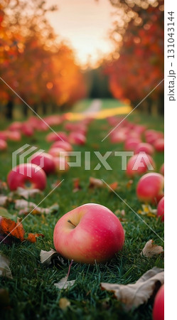 Vibrant Red Apples Scattered on the Grass During Autumn in a Picturesque Orchard at Sunset.