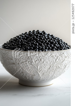 Dark berries piled high in an ornate ceramic bowl with intricate designs set against a light background