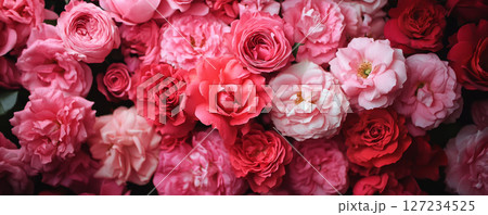 Banner of Abundant Pink and Red Roses in Full Bloom