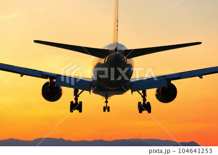 大阪国際空港(伊丹空港)の滑走路への航空機着陸 夕景