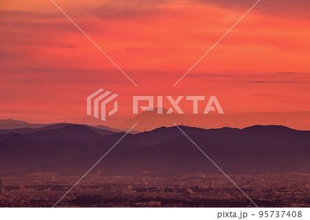 田原市 蔵王山展望台から望む朝焼けの富士山と豊橋市街