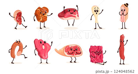 Cartoon meat characters. Funny raw minced meats mascots, pork beef ham snag slice wurst sausages salami chicken leg food funny character with face and hands set vector illustration original artwork