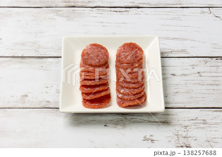 白の角皿の上に並べられた薄切りサラミソーセージ