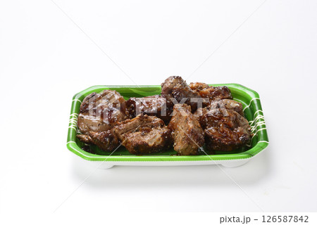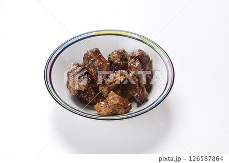 豚肉のスペアリブとにんにくの甘辛煮込み料理、白バック