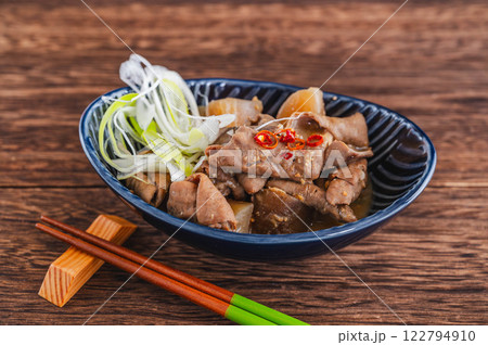 人参、蒟蒻、牛蒡、大根の入った豚のもつ煮込みを白背景で撮影