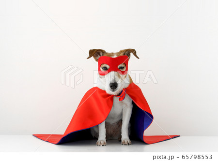 Jack Russell terrier dressed in a red superhero cape looks intently to the side against a vibrant orange backdrop