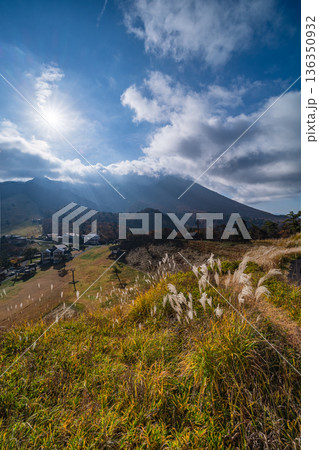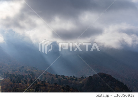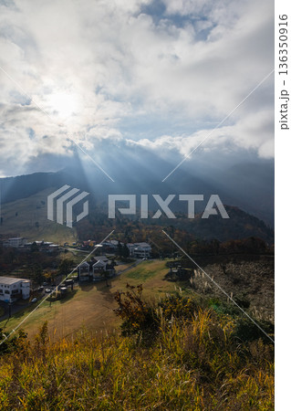 日本 鳥取県西伯郡大山町にある豪円山のろし台から眺める大山の紅葉と光芒