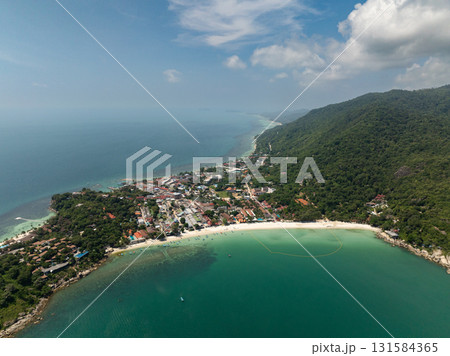 Lush green hills meeting the turquoise sea along a tropical coastline under a bright blue sky. Ko Pha Ngan, Thailand.