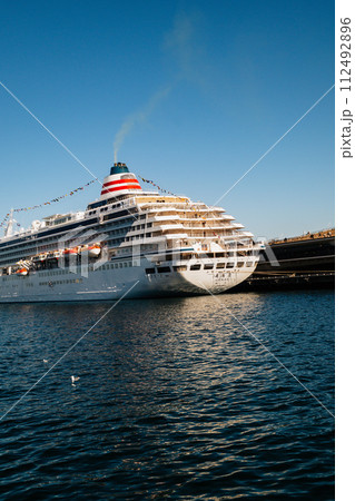 春の北海道函館市で函館港に寄港するクルーズ船セブンシーズマリナー号の風景を撮影