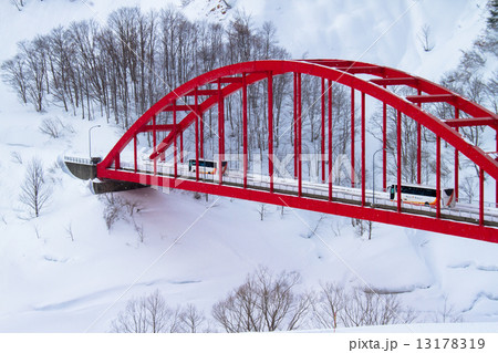 新潟県魚沼市 豪雪地を走る観光バスと赤い橋