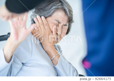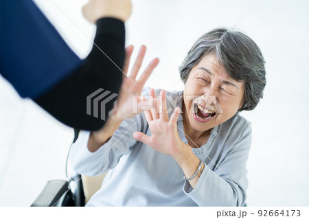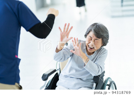 シニア、介護、おばあさん、女性、虐待、暴力、車椅子、男性、男性介護士、成人男性、男、お兄さん、20代