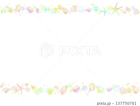 パステルカラーの可愛い貝殻のボーダー。トロピカルな夏の水彩フレーム。