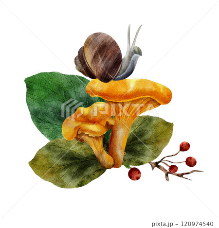 A snail crawls on chanterelle mushrooms. Nearby are green leaves of birch and linden. A branch with rowan berries in a realistic style. Watercolor hand drawn illustration on white background