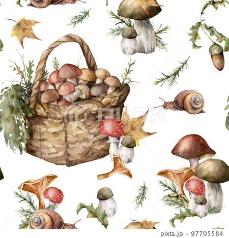 Watercolor autumn seamless pattern with mushrooms, basket and snail. Hand painted amanita muscaria, chanterelle, boletus isolated on white background. Illustration for design, print or background.