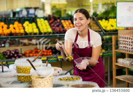 In vegetable department,female seller in apron put pickled olives in disposable container with ladle