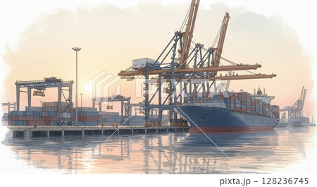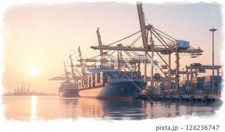 朝焼けの港と停泊中のコンテナ船