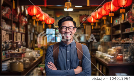 An engaging Asian seller warmly greets customers in a vibrant Chinese store, exuding professionalism and a welcoming demeanor. generative AI.