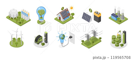 Isometric ecosystem. Electro and clean gas station, solar panels for smart energy house. Eco lifestyle, saving environment and nature, flawless vector icons